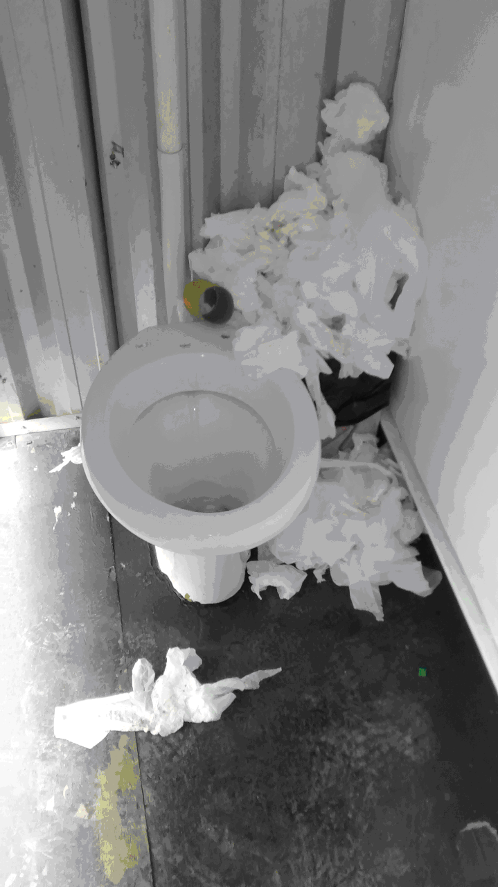 Além disso, verificou-se que as instalações sanitárias do estabelecimento ainda não estavam concluídas. Os empregados do comércio eram obrigados a utilizar as instalações sanitárias provisórias da obra, instaladas em contêineres em terreno próximo. Os banheiros, especialmente os destinados às mulheres, encontravam-se em precárias condições de manutenção e higiene, com vasos sanitários sem assento e tampa e com acúmulo de papéis usados em lixeiras sem tampa. O acesso aos banheiros provisórios era feito por área onde máquinas pesadas de obra trafegavam e com risco de queda de materiais içados por guindastes. O local de instalação dos banheiros provisórios também não dispunha de proteção contra intempéries, obrigando os trabalhadores, nos dias de chuva, a caminharem sem proteção e no meio da lama.
